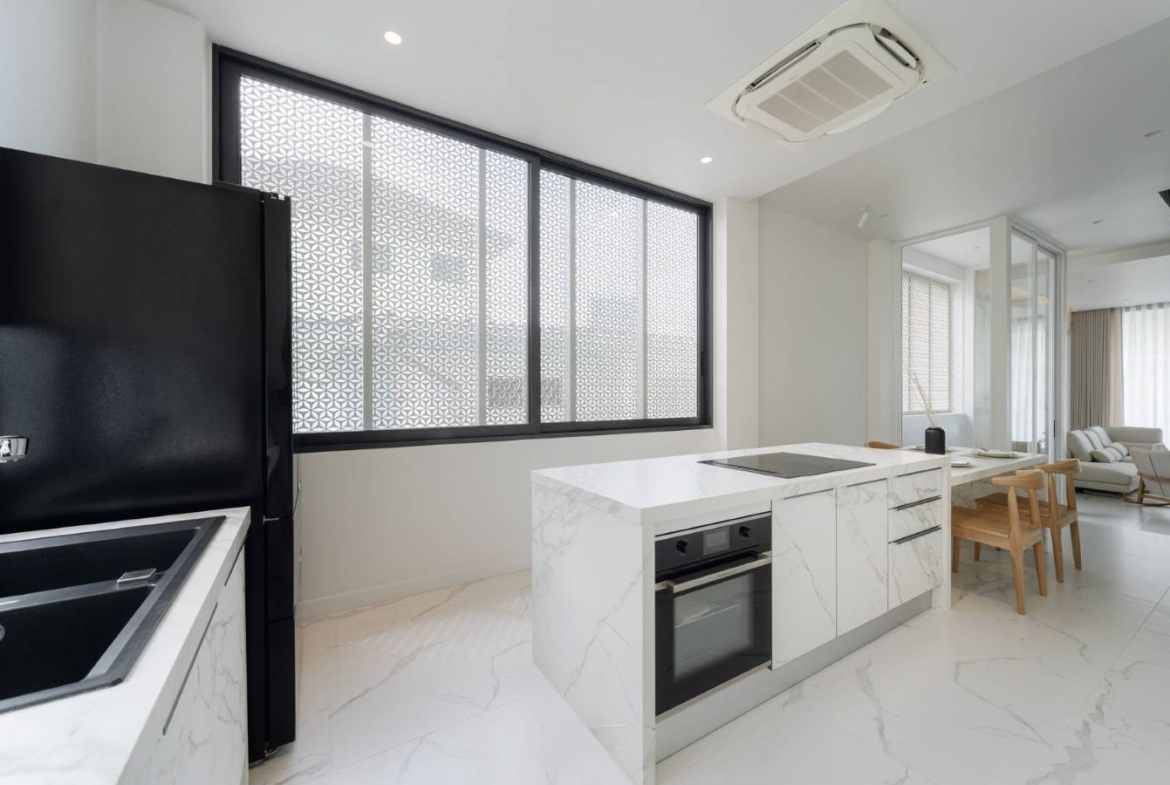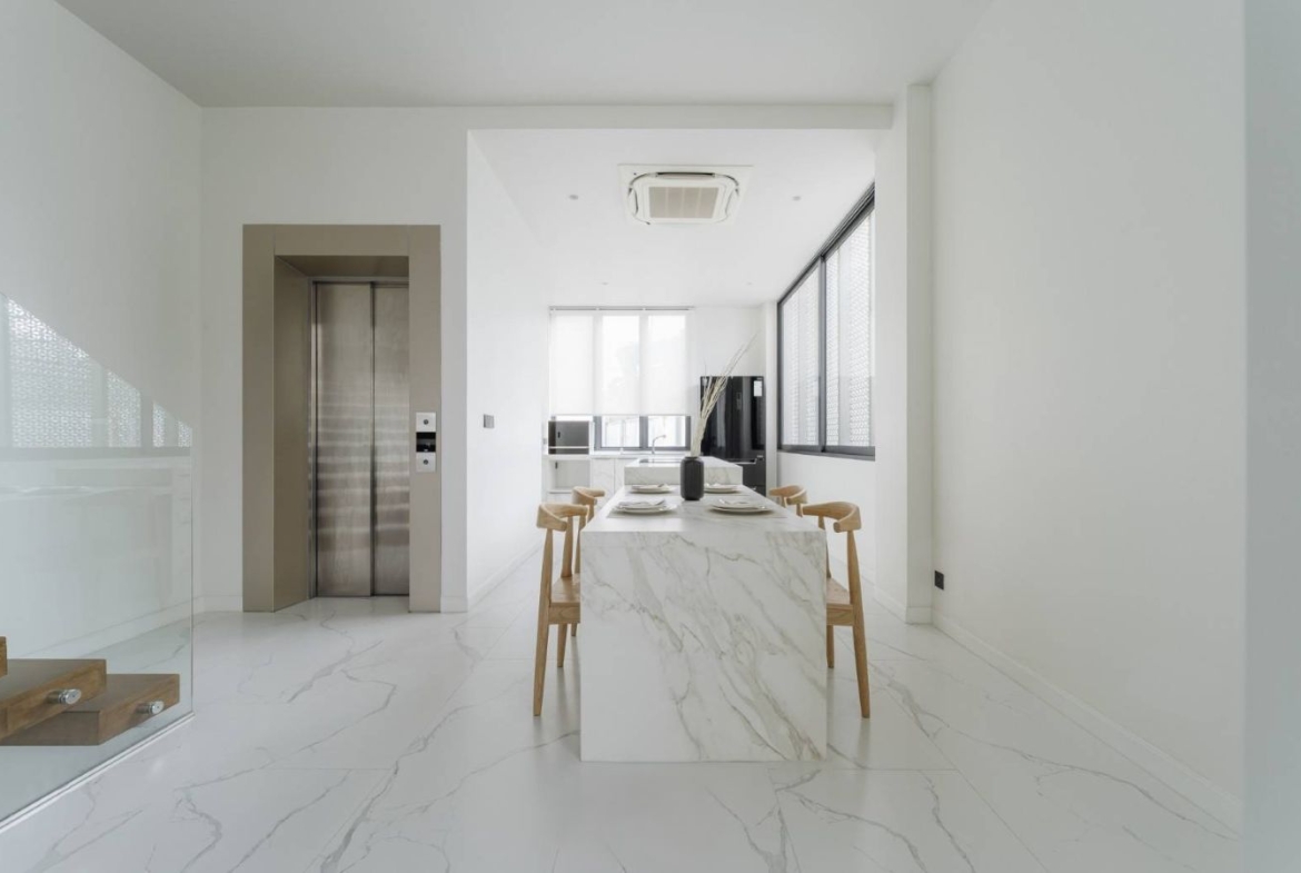 – Walk-in closet | Western kitchen | Thai kitchen | Laundry room | Maid’s room | Rooftop terrace | Automatic sanitary ware in every room | Electrical appliances and dishwasher | EV Charger installation point