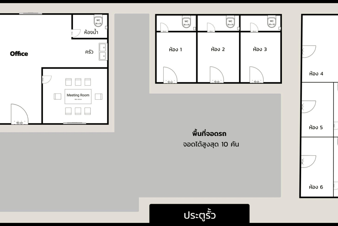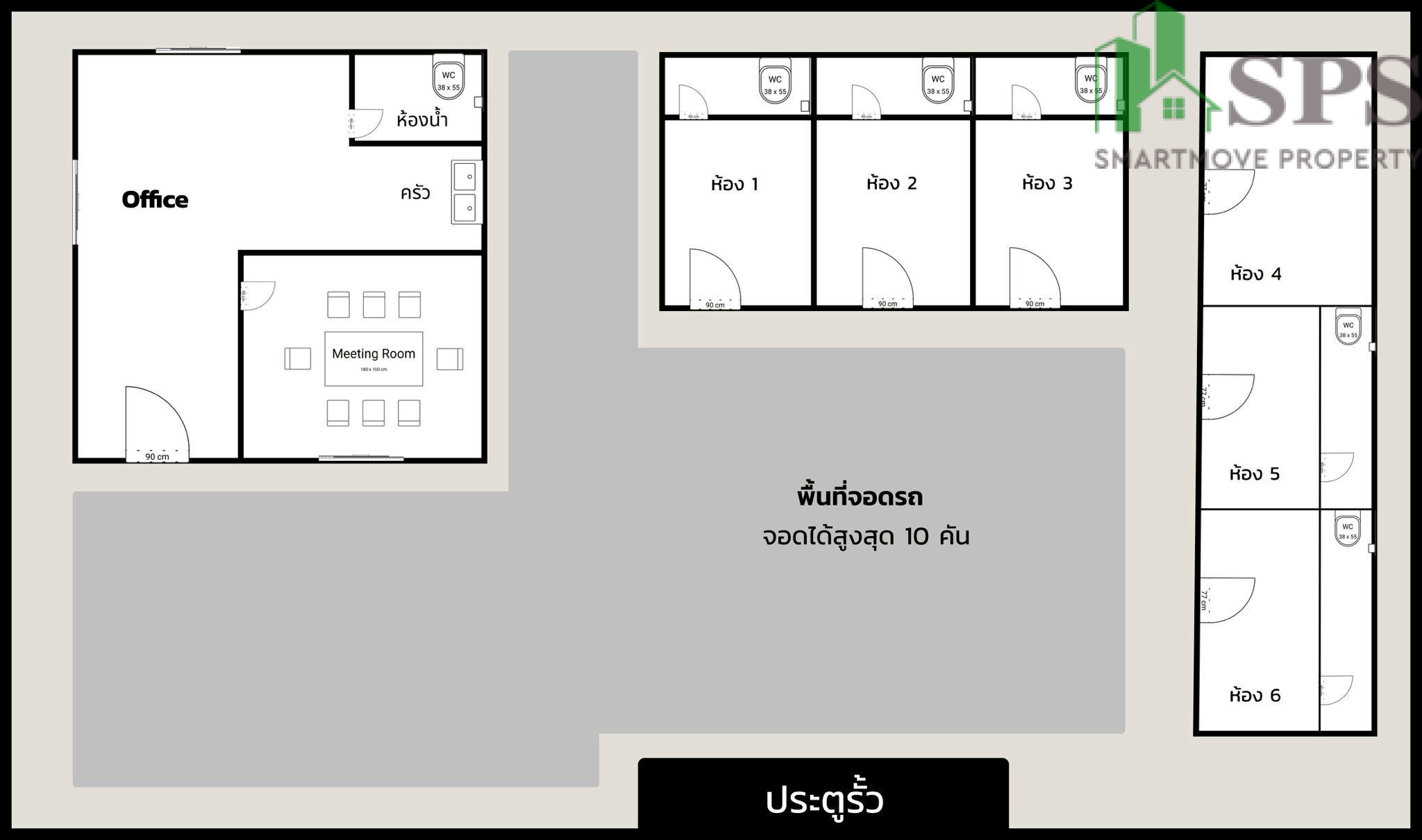 • พื้นที่สำนักงาน 1 ห้อง (ห้องกระจกกั้น), โซนครัว และห้องน้ำ 1 ห้อง