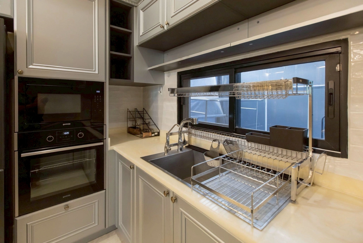 – Living Area: Spacious living room with a built-in premium kitchen.