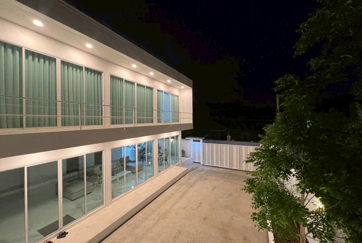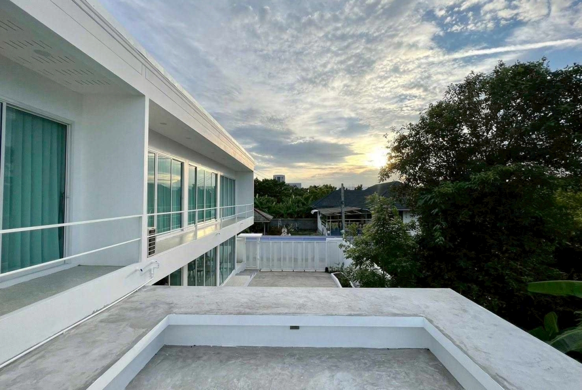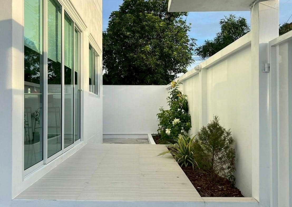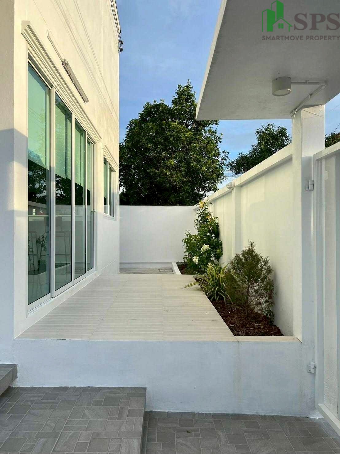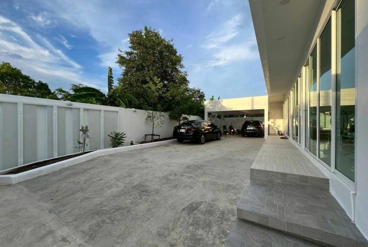 For rent, a beautiful, modern, white minimalist house, privately built and located near Suvarnabhumi Airport, Robinson Lifestyle Lat Krabang, Homepro, and Little Walk Lat Krabang.