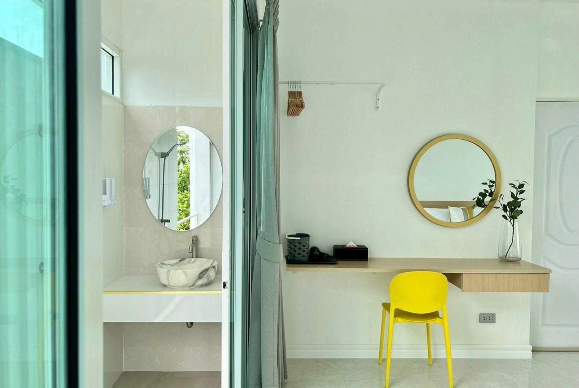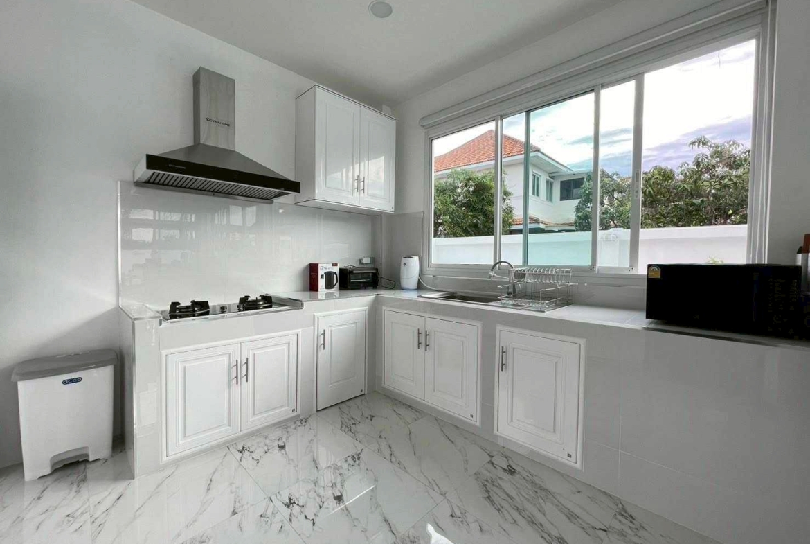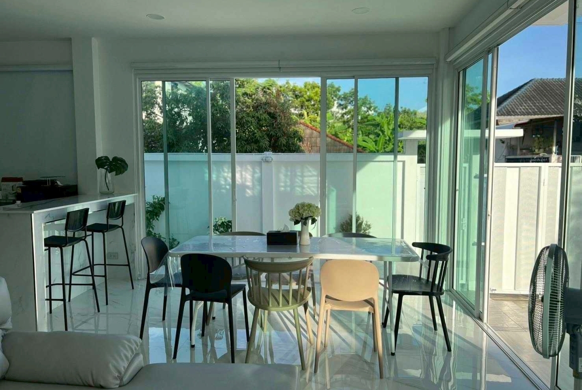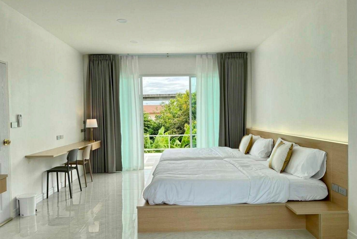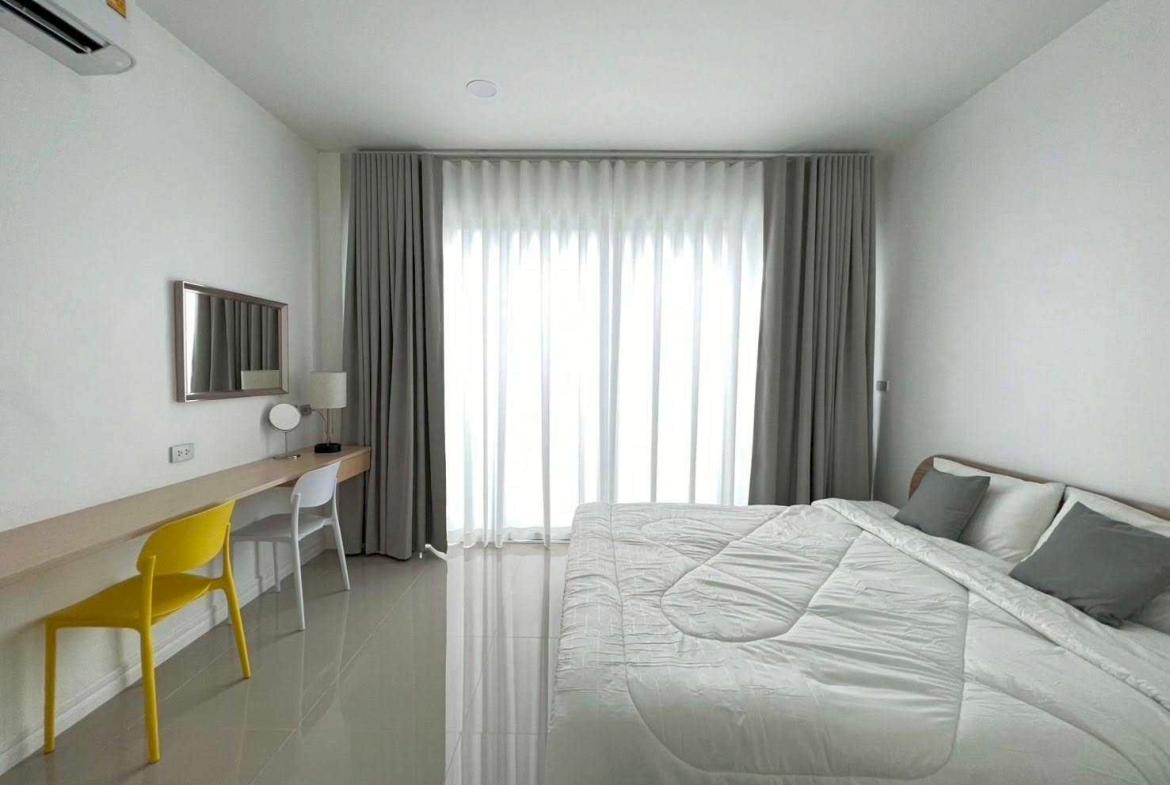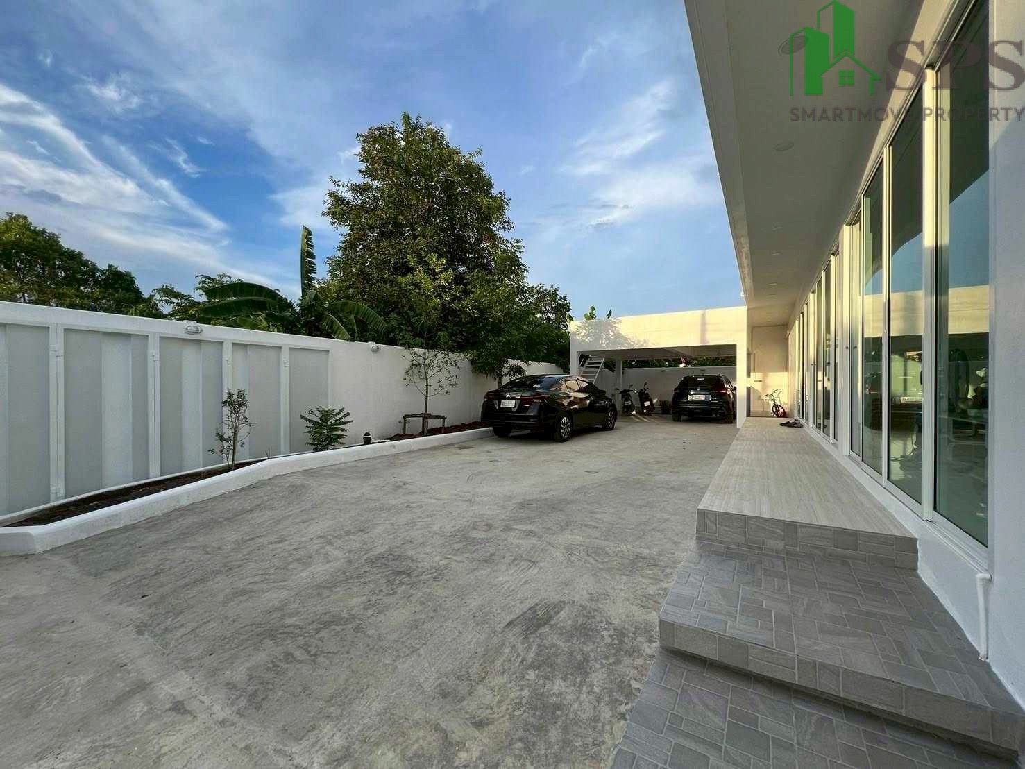 For rent, a beautiful, modern, white minimalist house, privately built and located near Suvarnabhumi Airport, Robinson Lifestyle Lat Krabang, Homepro, and Little Walk Lat Krabang.